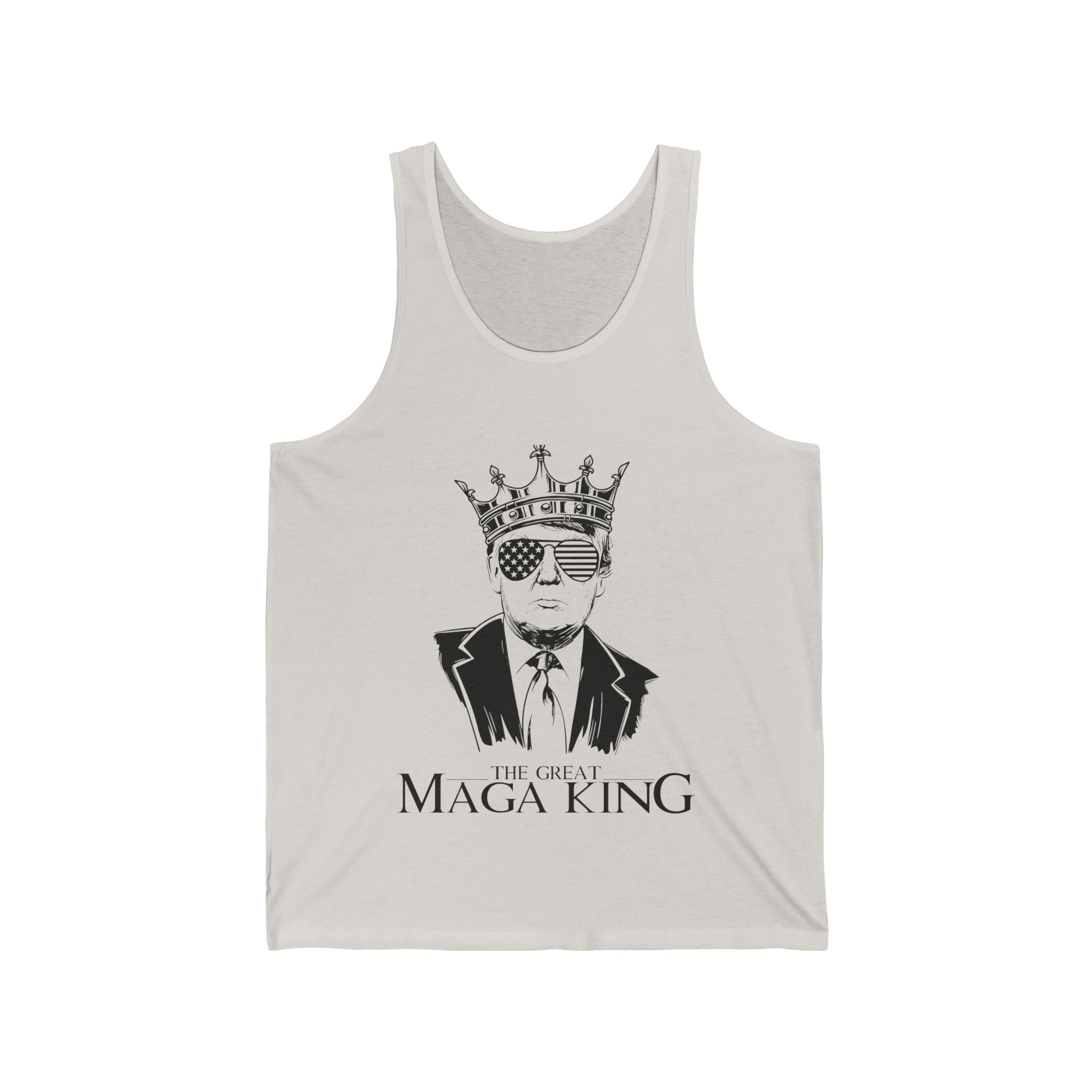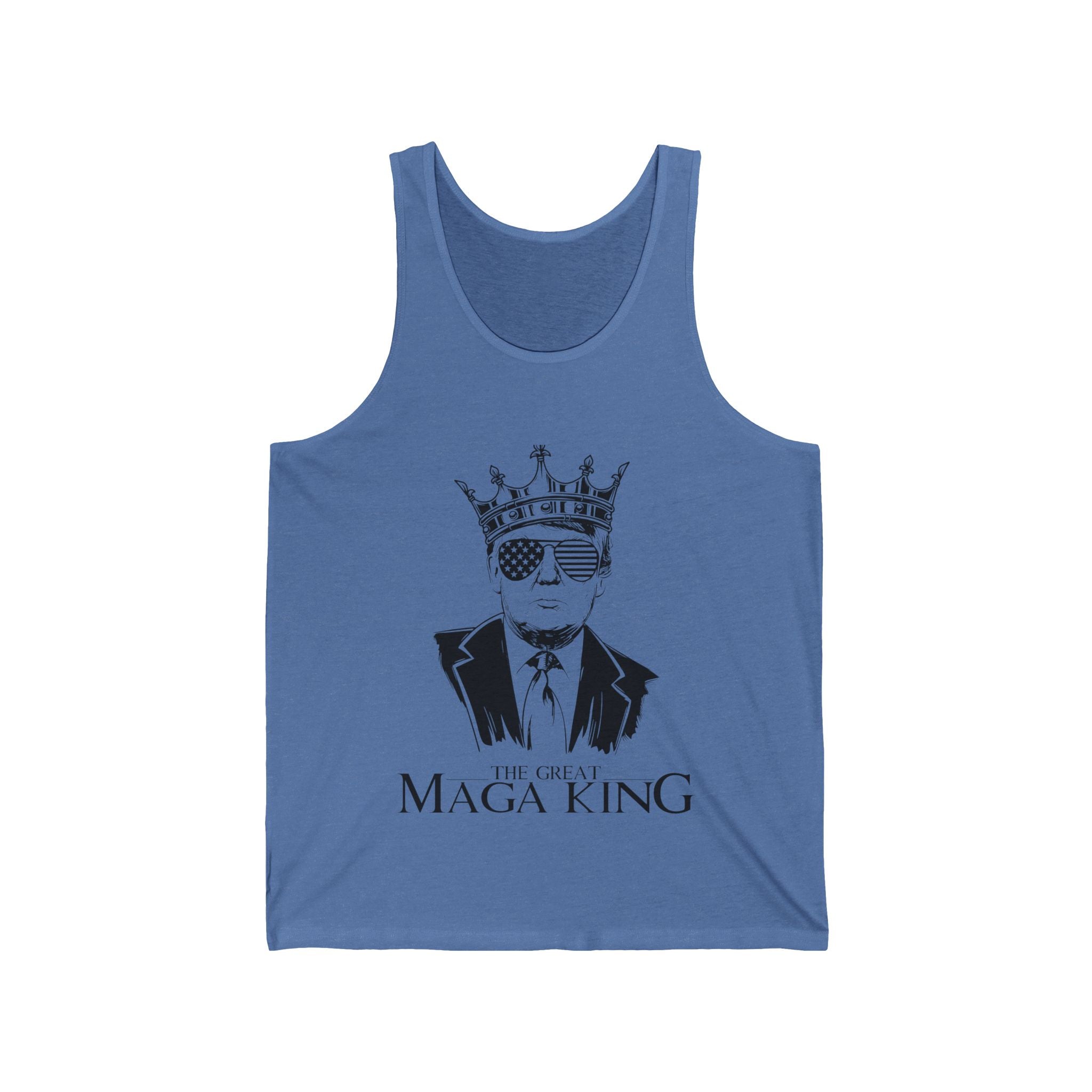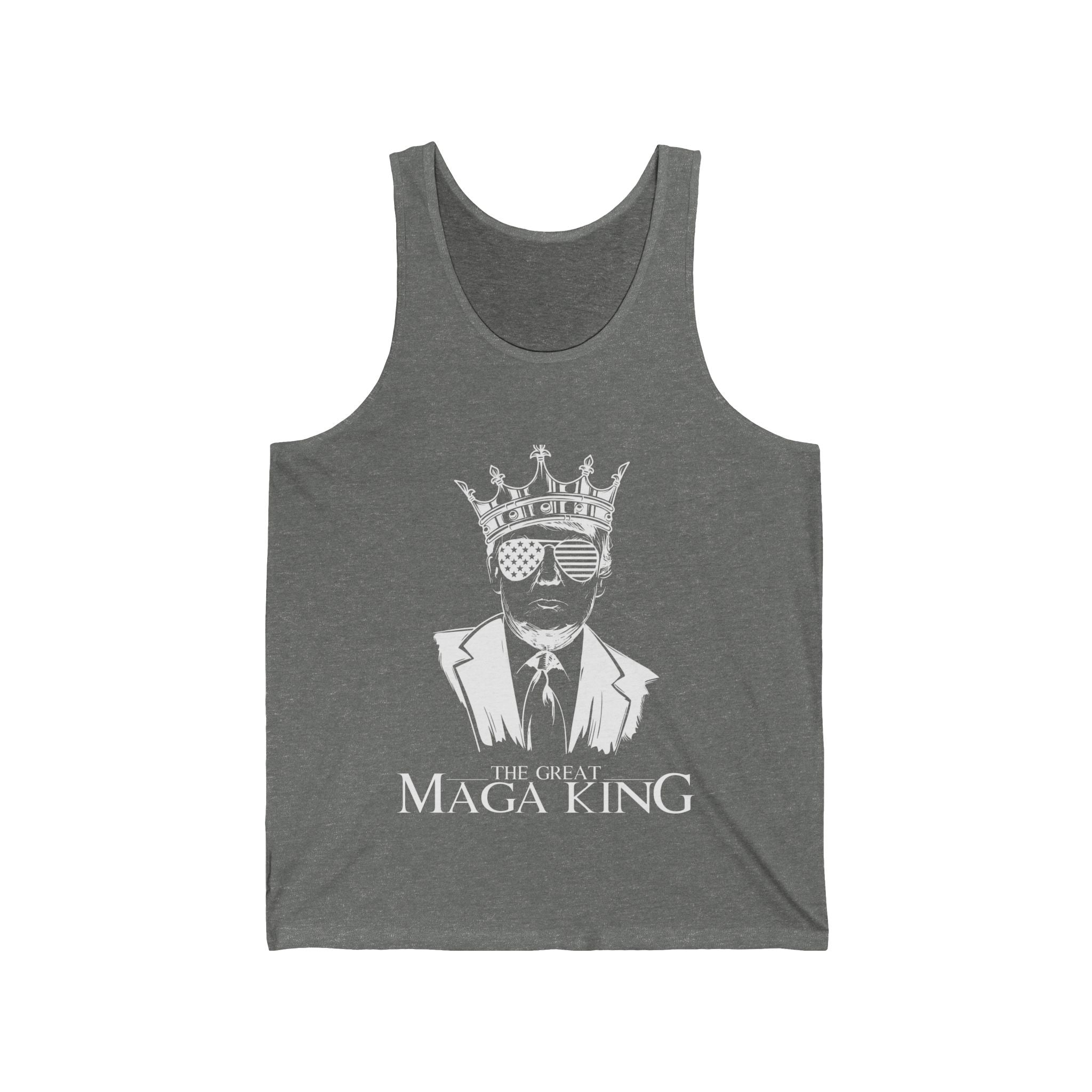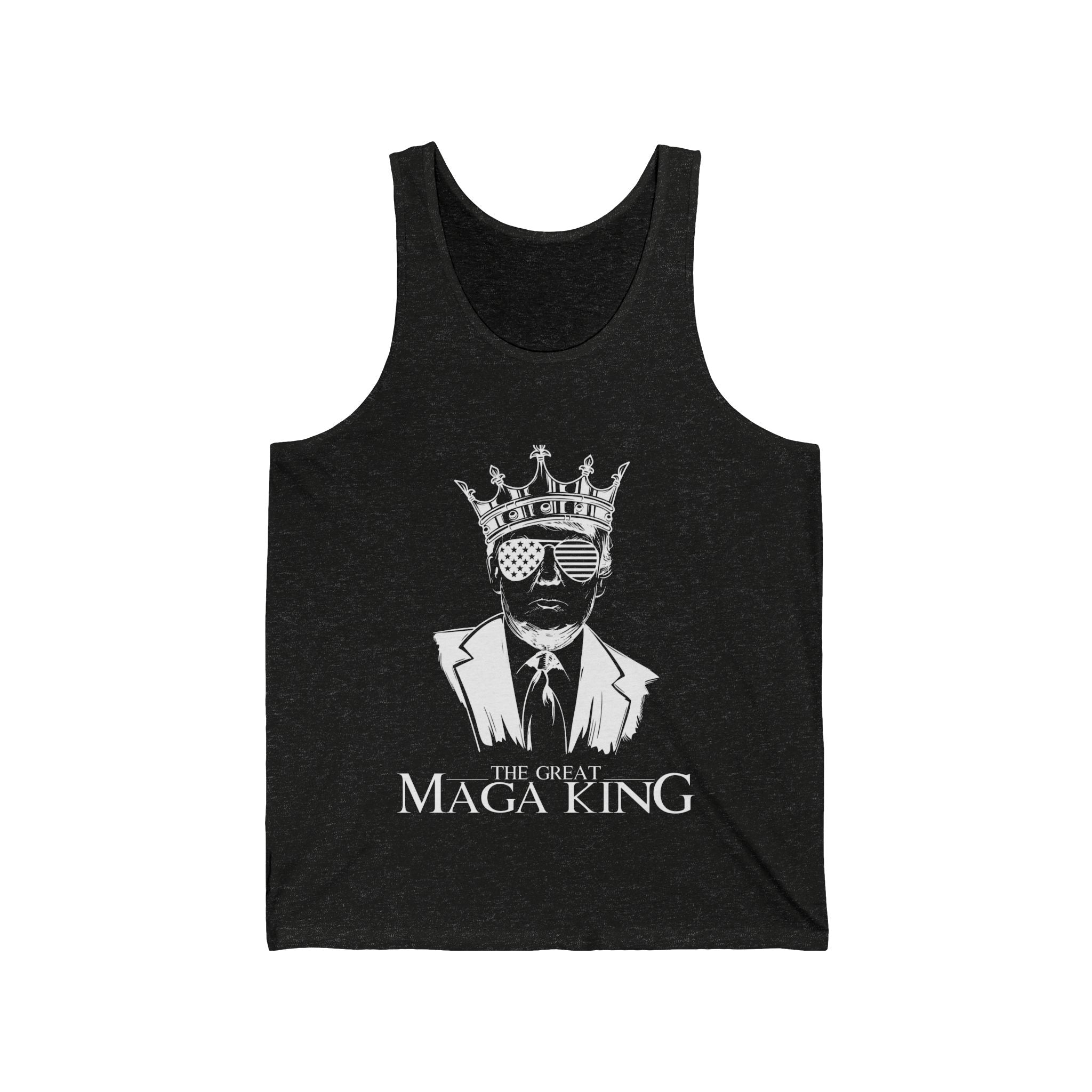 This unisex jersey tank top features our printed patriotic, 2A inspired clothing, with the MAGA King design.