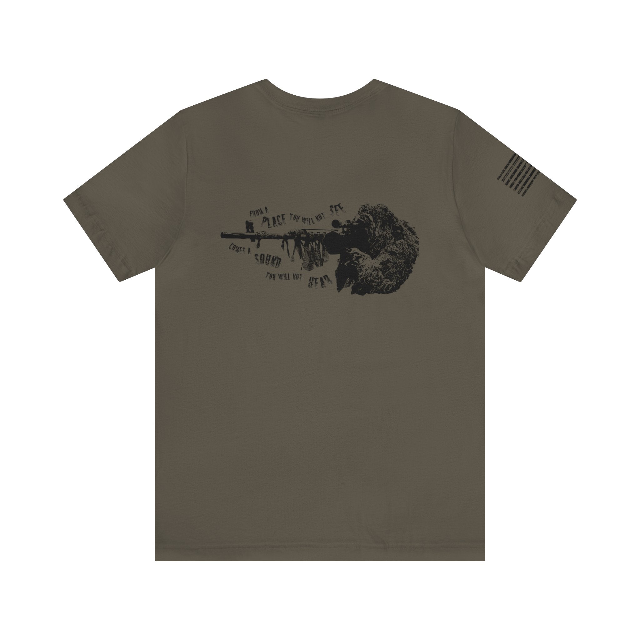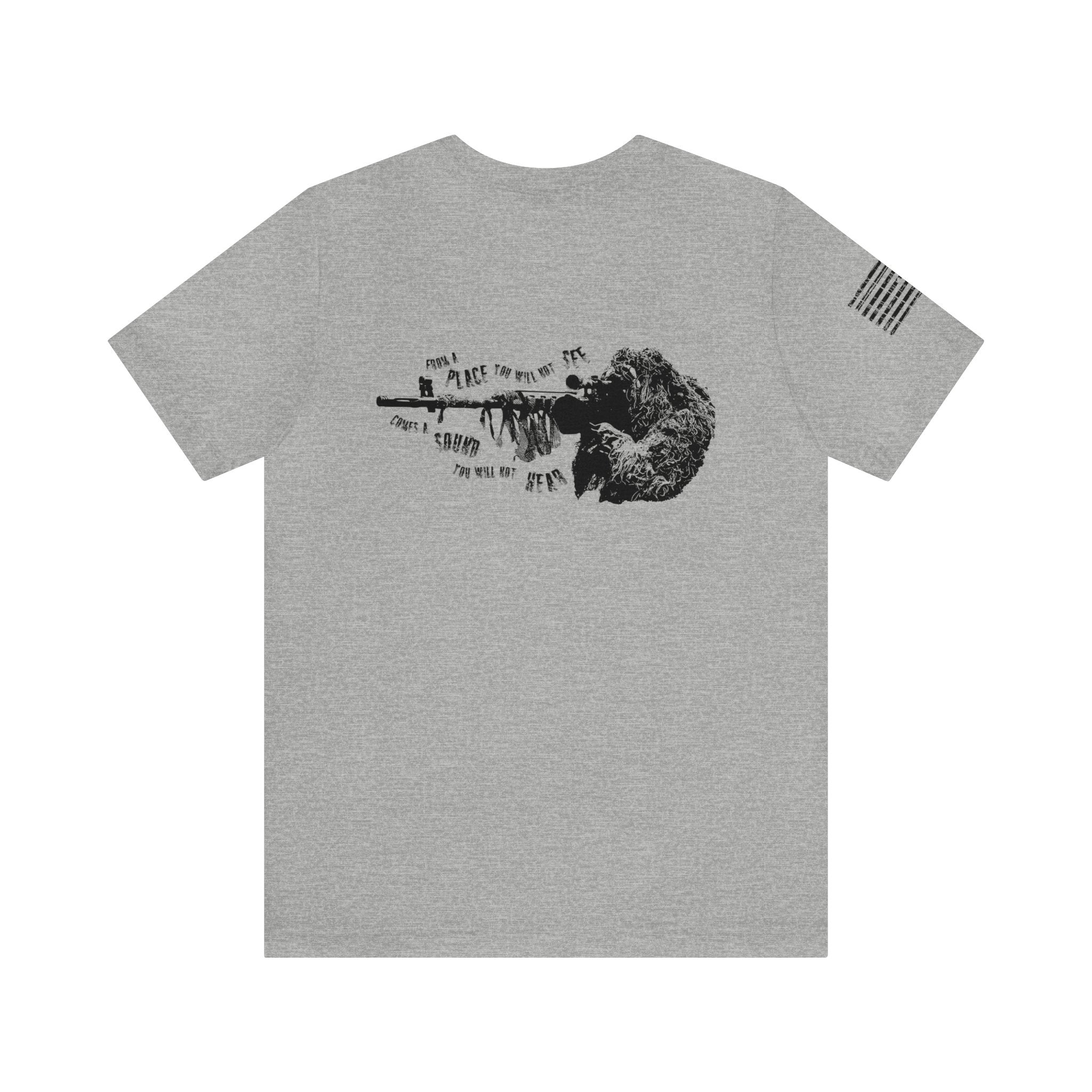 From a place you will not see, comes a sound you will not hear. Our printed patriotic, 2A inspired clothing, features our Sniper design. Get this printed on a unisex t-shirt that fits like a well-loved favorite. Super soft cotton and excellent quality print makes one to fall in love with it over and over again.