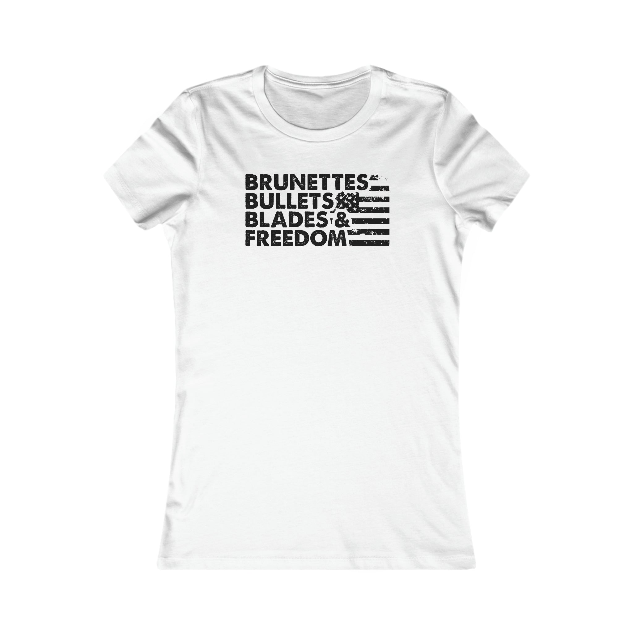 This printed patriotic, 2A inspired short sleeve cotton-blend t-shirt features our Brunettes, Bullets, Blades & Freedom adult womens t-shirt design. Her go-to tee fits like a well-loved favorite, featuring a slim feminine fit. Additionally, it is really comfortable - an item to fall in love with.